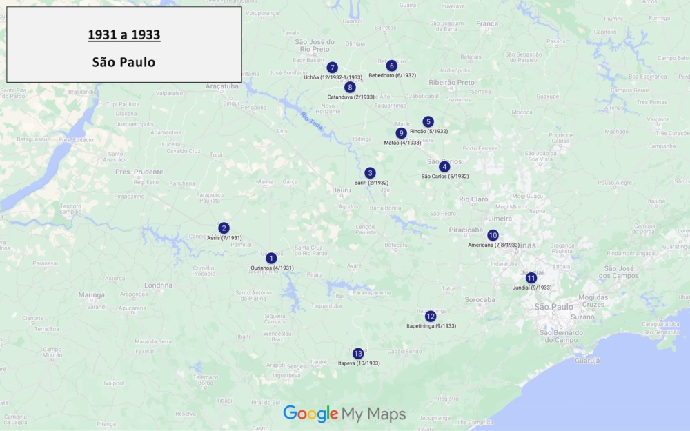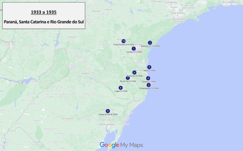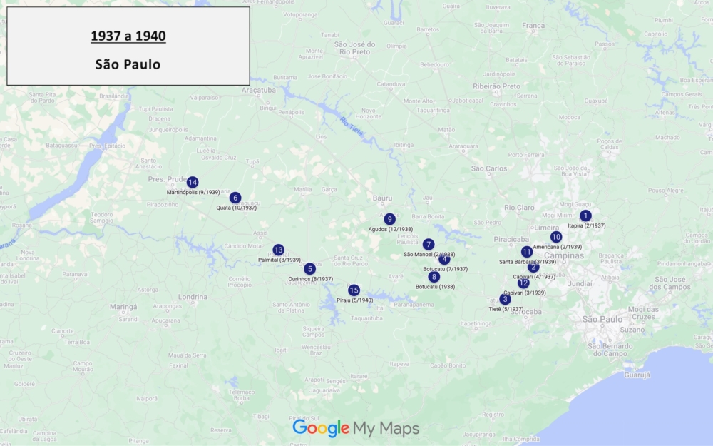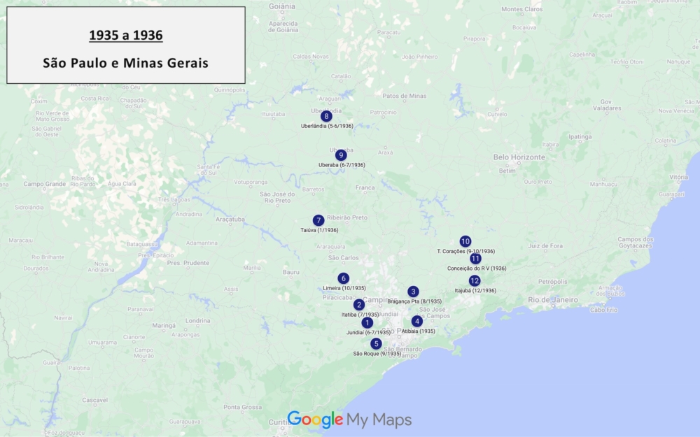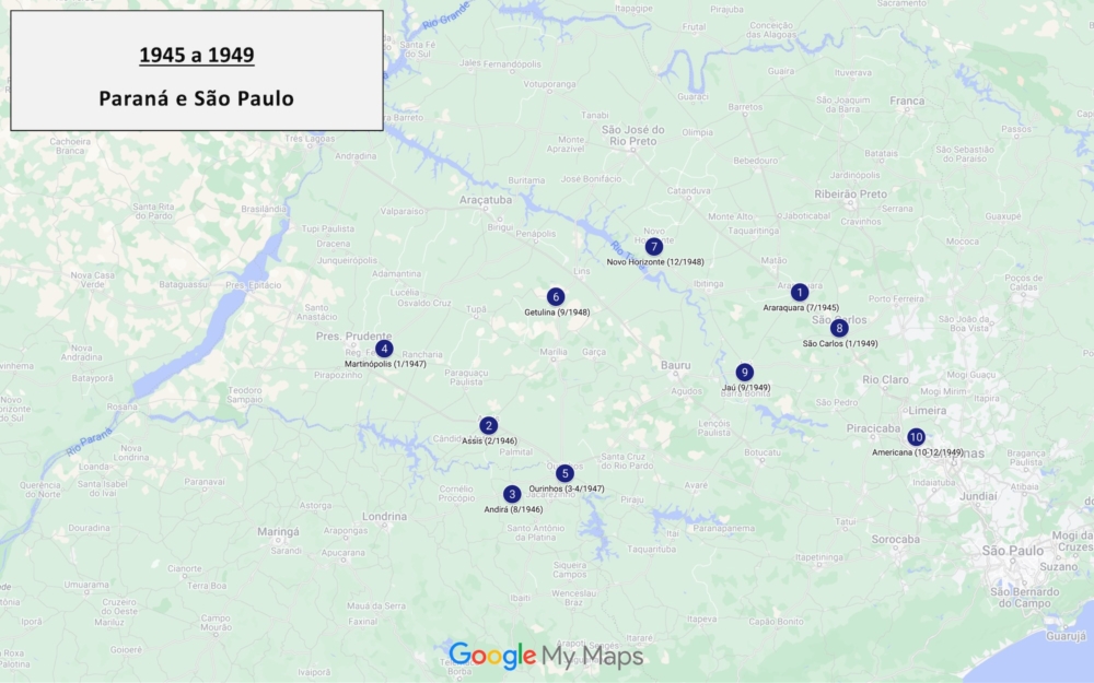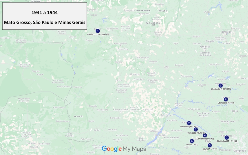 A sequência de mapas abaixo mostra os locais por onde passou o Circo Teatro Universal, desde a sua fundação até 1949.